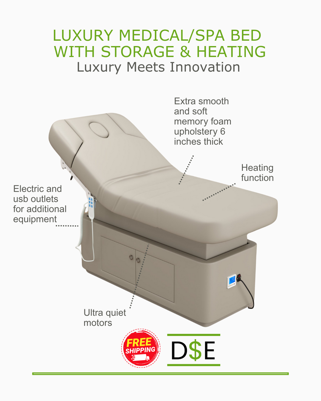 Introducing our new fully electric,smooth,plush,soft upholstery/cushion medical or spa Facial/ Massage/Treatment bed with amazing upgraded features like heating,storage,electric panel,USB connections and much more without extra cost in beautiful neutral Sand Color at an amazing price with free shipping.