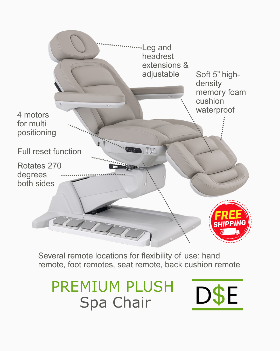 Fully electric extremely comfortable and luxurious multi positional bed chair treatment table for spa,botox,injectibles,facials,waxing,lashes and many other applications.This luxury bed rotates 270 degrees both sides adding to positional capability.Amazing price and free shipping in continental USA